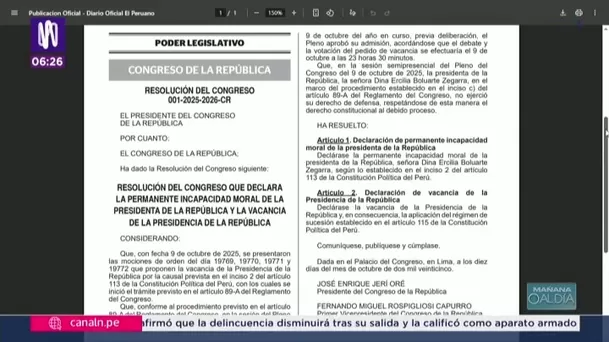 La Resolución Legislativa 001-2025-2026-CR declara oficialmente la “incapacidad moral permanente” de Dina Boluarte, conforme al artículo 113 de la Constitución. En su segundo artículo, establece la vacancia de la Presidencia de la República y la aplicación del régimen de sucesión regulado por el artículo 115.