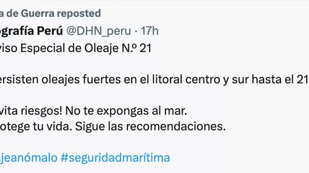 La Marina de Guerra del Perú advirtió que el oleaje seguirá hasta el miércoles 21 en todas las playas del país. Indeci recomienda evitar actividades en el mar y zonas de camping
