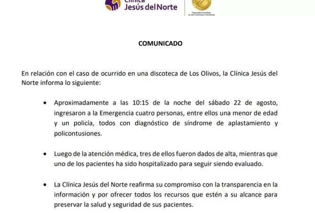 Una menor de 17 años que resultó herida tras acudir a la fiesta organizada en la discoteca Thomas Restobar, fue dada de alta de la clínica Jesús del Norte de Los Olivos, así lo dio a conocer la ministra de la Mujer, Rosario Sasieta.