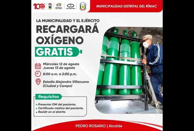 Las familias de pacientes con COVID-19 que busquen oxígeno medicinal podrán abastecerse del recurso de manera gratuita este miércoles 12 y jueves 13 de agosto. La Municipalidad del Rímac y el Ejército del Perú estarán a cargo de la entrega.