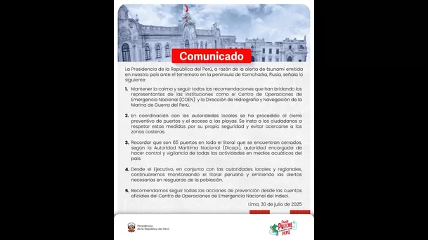 Alerta de tsunami: Presidencia insta a mantener la calma