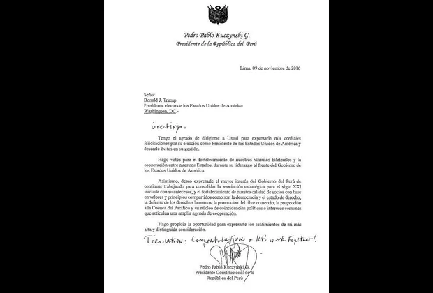 “Tengo el agrado de dirigirme a usted para expresarle mis cordiales felicitaciones por su elección como presidente de Estados Unidos de América y desearle éxitos en su gestión”, indica el documento enviado por PPK.