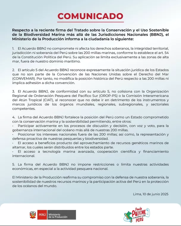 El Ministerio de la Producción salió al frente de las especulaciones. En un comunicado oficial, la cartera aclaró que la firma del Tratado de Alta Mar no pone en riesgo los derechos soberanos del Perú sobre sus 200 millas marítimas. El documento responde a cuestionamientos surgidos tras la suscripción del acuerdo por parte de la presidenta Dina Boluarte durante su viaje a Francia.