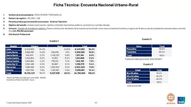 La encuesta fue realizada el 28 y 29 de agosto de 2025, con una muestra de 1208 personas mayores de 18 años en zonas urbanas y rurales de los 24 departamentos y la provincia del Callao. El estudio tiene un margen de error de ±2.8% y un nivel de confianza del 95%.
