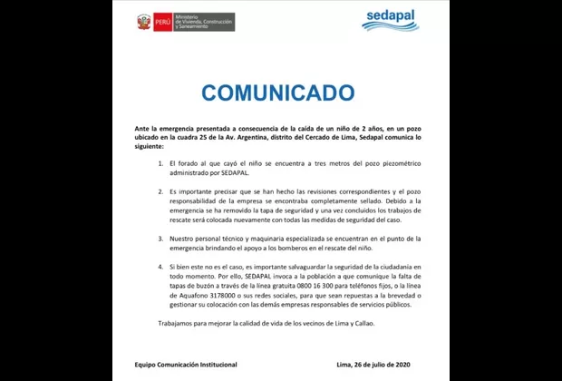 Ante la tragedia presentada a consecuencia de la muerte de un niño de 2 años en un pozo ubicado en la cuadra 25 de la Av. Argentina, en el distrito del Cercado de Lima, Sedapal informó, a través de un comunicado, que el forado al que cayó el menor que finalmente falleció no es un pozo de su administración.