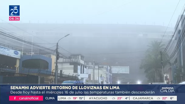 El frío y la humedad regresan a Lima. El Servicio Nacional de Meteorología e Hidrología del Perú (Senamhi) anunció que hasta el miércoles 16 de julio se presentarán lloviznas en Lima Metropolitana, acompañadas de una mayor sensación de frío y alta humedad ambiental.