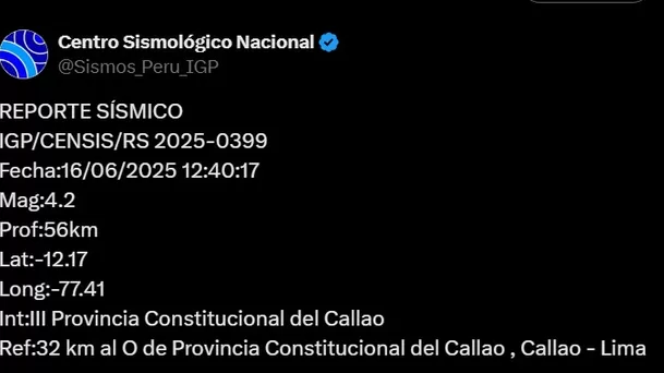 Un sismo de magnitud 4.2 se registró este lunes 16 de junio a las 12:40 p.m. en la provincia constitucional del Callao, según el reporte oficial del Centro Sismológico Nacional del Instituto Geofísico del Perú (IGP).