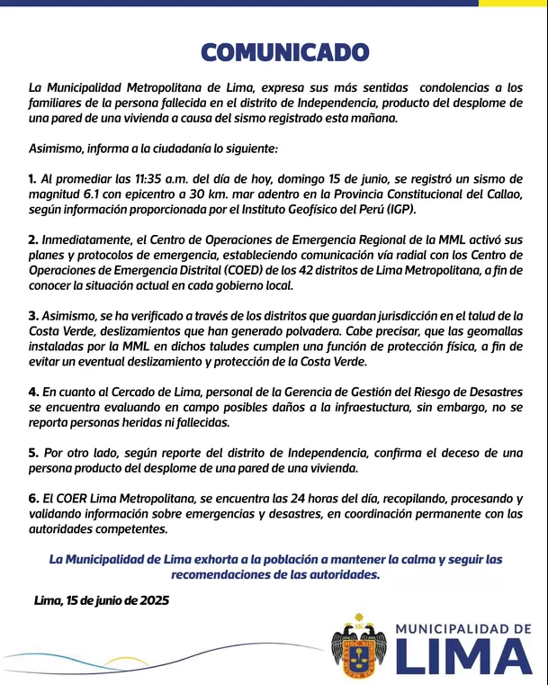 Por su parte, la Municipalidad de Lima dio sus condolencias ante este hecho e indicó que tras el sismo se activaron los planes y protocolos de emergencia en los 42 distrito de Lima.