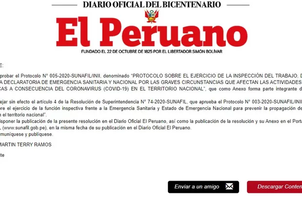 Un nuevo protocolo para la inspección durante el estado de emergencia fue aprobado este miércoles por la Superintendencia Nacional de Fiscalización Laboral (Sunafil). El nuevo protocolo se aplicará en todas las fases de la reactivación.