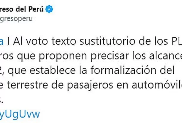 "Con una votación histórica de 115 congresistas a favor, el Parlamento acaba de aprobar la ley que impulsé, para formalizar el transporte de pasajeros en autos colectivos”, escribió en Twitter el legislador Carlos Semeón Hurtado.