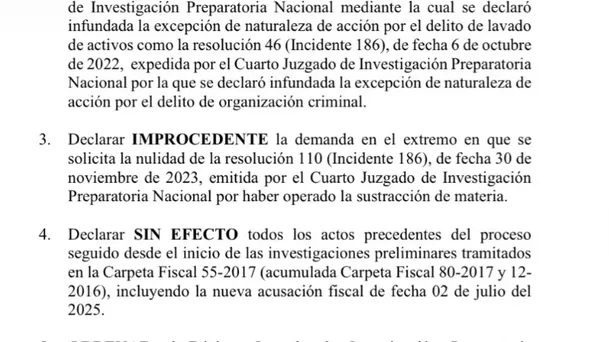 La sentencia del TC invalida la Resolución N.º 35 emitida por el Cuarto Juzgado de Investigación Preparatoria Nacional, y deja sin efecto las imputaciones por lavado de activos, organización criminal, falsa declaración y falsedad genérica.
