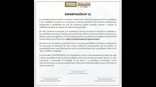 El Tribunal de Honor del Jurado Nacional de Elecciones exhortó a la ciudadanía a informarse sobre las propuestas de los candidatos inscritos en las elecciones generales 2026.