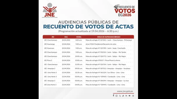 Diversos Jurados Electorales Especiales (JEE) iniciarán este lunes 20 de abril las audiencias públicas de recuento de votos en el marco de las Elecciones Generales 2026, según informó el Jurado Nacional de Elecciones (JNE).
