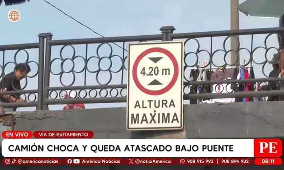 El conductor, que se dirigía hacia el norte de Lima, intentó cruzar el puente a pesar de las señales que indican una altura máxima permitida de 4.20 metros. Al quedar atascado, se evidenciaron daños en la parte inferior del puente, incluyendo desprendimientos de material y arañazos visibles.