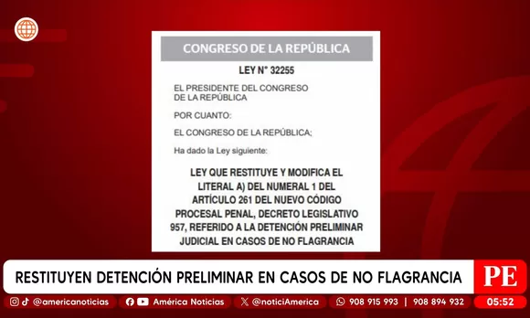El Congreso de la República promulgó la Ley N° 32255, que restituye la detención preliminar en casos de no flagrancia, permitiendo a los jueces dictar esta medida a solicitud del fiscal cuando existan riesgos procesales.