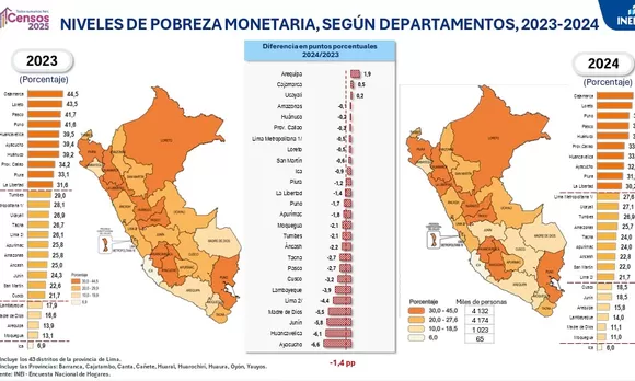 El Instituto Nacional de Estadística e Informática (INEI) informó que la pobreza monetaria afectó al 27.6 % de la población en el año 2024. Esta cifra representa una reducción de 1.4 puntos porcentuales respecto al 2023, lo que equivale a más de 386 mil personas que salieron de la pobreza. En total, más de 9.3 millones de peruanos siguen en esta condición.