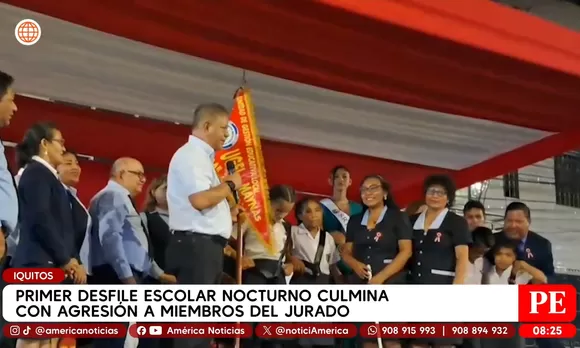 El primer desfile escolar nocturno en Iquitos por Fiestas Patrias terminó en medio de gritos, protestas y botellas arrojadas al estrado donde se encontraban las autoridades educativas. Padres de familia y estudiantes mostraron su descontento por los resultados del concurso y protagonizaron actos de agresión contra el jurado calificador.