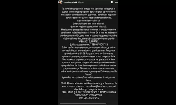 “Sabes perfectamente que tengo cámaras en mi casa, y todo lo que has hablado y expresado de la que dices amar. Tengo todo grabado desde el día 1 porque mi meta fue únicamente exponerte para que, por primera vez en tu vida, tengas un límite. Si no puse todo lo que tengo es porque me quedaba 1% de no agrandar esto, pero si tú sigues mintiendo y dando a entender que yo disfruto del dolor de otras personas, subiré todo y sabes que pruebas tengo. Tienes todo el derecho de arrepentirte, luchar y más, pero no embarres a gente que el único responsable fuiste tú”, manifestó.