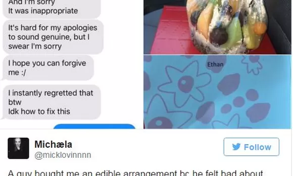 Michaela le contó a BuzzFeed que estaba hablando con un chico llamando Ethan el año pasado cuando este le pidió fotos suya sin ropa, así que dejó de hablarle. Más temprano este año, él intentó volverle a hablar y ella, de broma, le dijo que lo perdonaría si le mandaba una canasta de frutas.