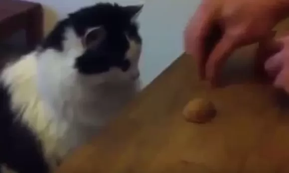 Un video colgado a YouTube muestra a un pequeño felino jugando con su amo a encontrar el objeto escondido en uno de tres cascarones.