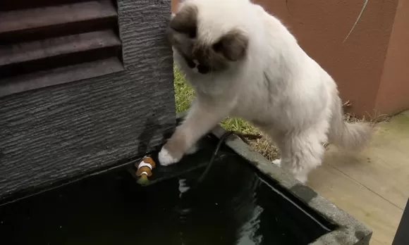 El pez payaso – igualito a Nemo – estaba inmovilizado y lejos de la profundidad de un estanque. Un gato advierte esto y no duda en apoyarse, mover su pata y darle una empujadita para que vuelva a nadar.
