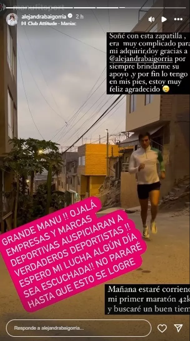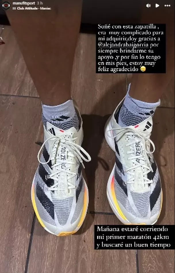 A través de sus historias de Instagram, la empresaria de Gamarra compartió la publicación que el deportista, identificado como ‘Manu Sports’, mostró en su cuenta, donde agradeció a Alejandra por cumplirle uno de sus sueños al obsequiarle las exclusivas zapatillas de Adidas Adizero Adios Pro 3.