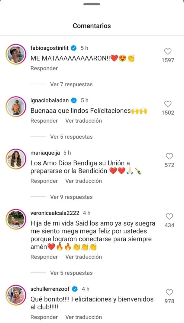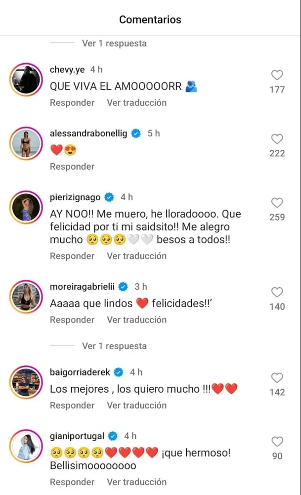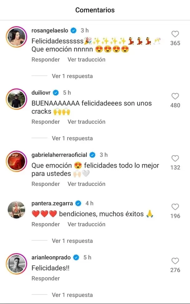 Por su parte, Rosángela Espinoza también comentó: “Felicidadessss. Qué emoción”. Otro combatiente que también escribió fue Chevy: “QUÉ VIVA EL AMOR”. En cuanto a conductores, Renzo Schuller los felicitó: “Qué bonito. Felicitaciones y bienvenidos al club”. Su compañera, Johanna San Miguel se emocionó y colocó varios emojis de corazones.