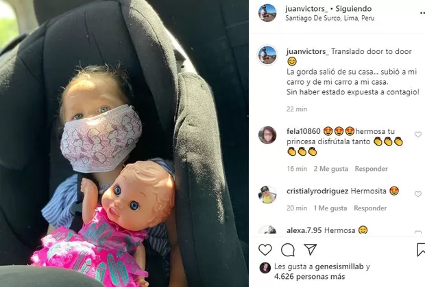 “Translado door to door. La gorda salió de su casa… subió a mi carro y de mi carro a mi casa ¡Sin haber estado expuesta a contagio!”, escribió Juan Víctor junto a una foto de Lara con su mascarilla.