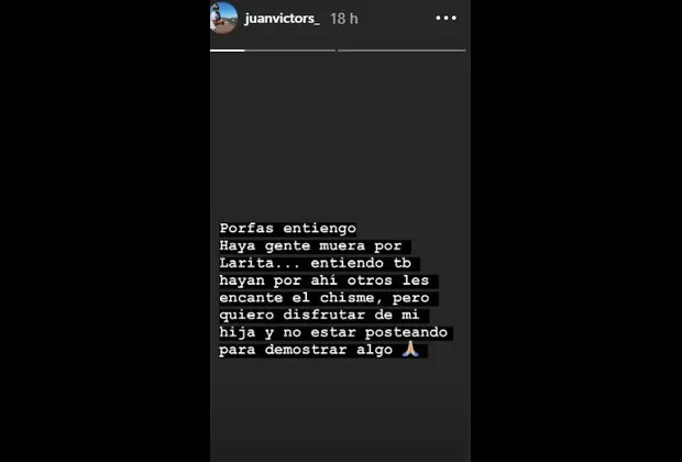 “Por fas, entiendo que haya gente (que) muera por Larita… Entiendo también, que haya por ahí otros que les encante el chisme, pero quiero disfrutar de mi hija y no estar posteando para demostrar algo”, expresó el papá de Lara.