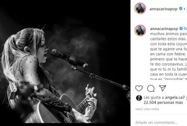 “No he estado con muchos ánimos para tomarme fotos ni cantarles estos días. La verdad es que, con toda esta coyuntura pandémica, el que te agarre una fuerte gripe y caigas en cama con fiebre, te sugestiona y lo primero que te hace pensar es que ya te dio coronavirus. Luego te acuerdas que, ni tú ni tu familia han salido de casa en toda la cuarentena y piensas que es “imposible” haberte contagiado", escribió Anna Carina.