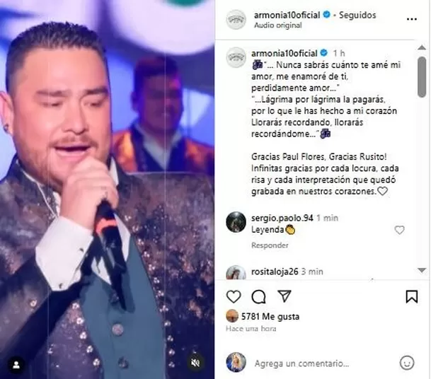 Con un recopilación de videos en concierto, Armonía 10 quiso rendir tributo a Paul Flores en sus redes sociales, dedicándole unas sentidas palabras, en el cual le agradecían por su talento y manera de ser.
