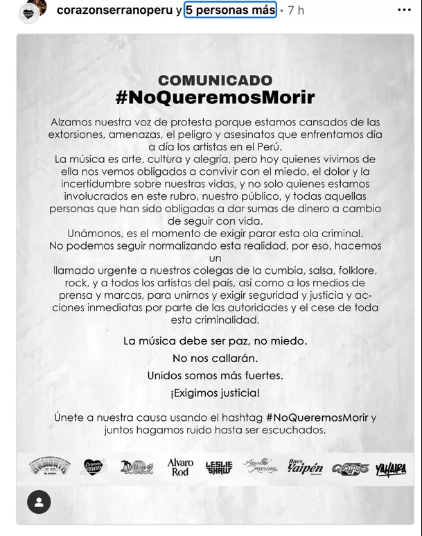 “Estamos cansados de las extorsiones, amenazas, el peligro y asesinatos que enfrentamos día a día los artistas en el Perú”,expresaron los artistas.