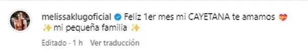 “Feliz 1er mes mi CAYETANA te amamos. Mi pequeña familia”, fue la leyenda de la foto que publicó Melissa, cuyos seguidores aplaudieron que la familia entera se haya reunido para celebrar esta fecha especial.