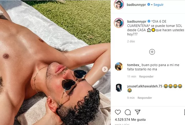 Le sigue de cerca, con 4 millones 383 mil 621 "me gusta", tres fotografías de Bad Bunny tomando el sol semidesnudo que corresponden al día 6 del confinamiento obligatorio.
