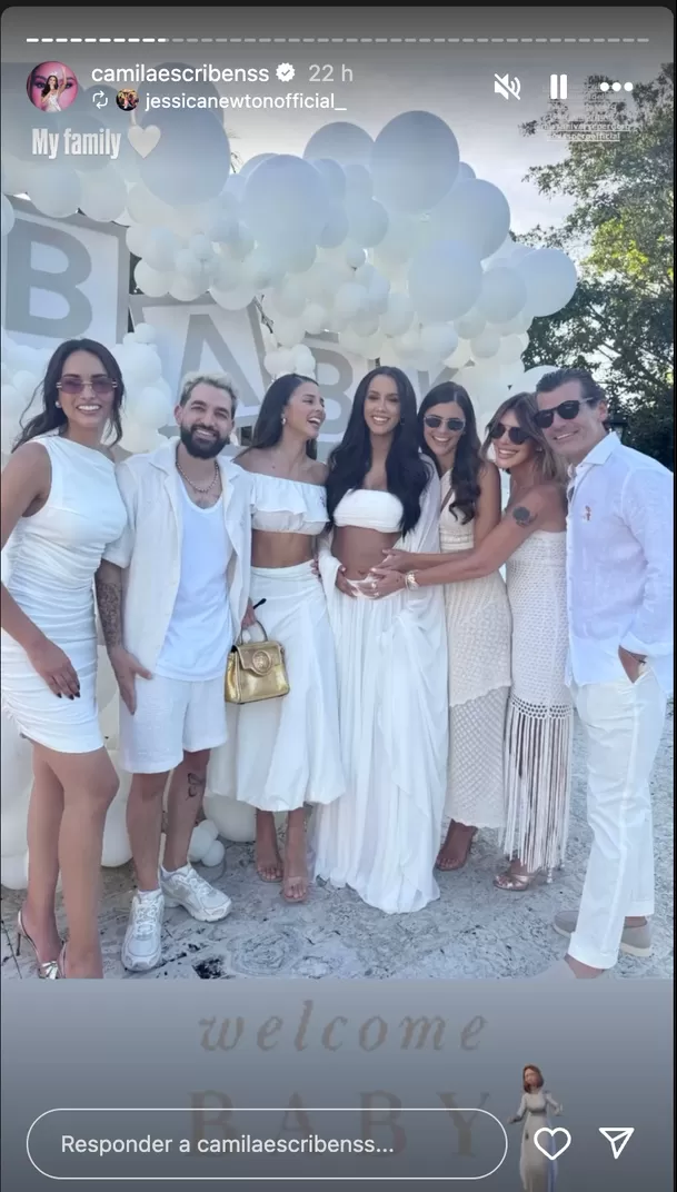 La exreina de belleza lució un atuendo blanco con el que reveló su pancita y expresó su agradecimiento con amigos y familiares.