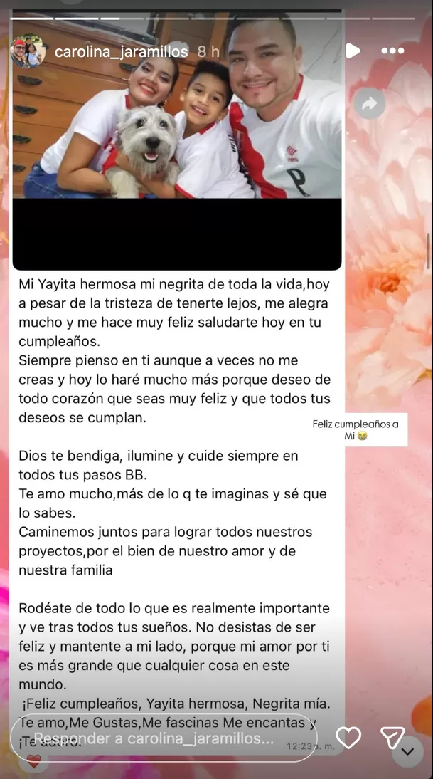 “Mi Yayita hermosa, mi negrita de toda la vida”, empieza el mensaje, donde Paul expresa su deseo de que Carolina cumpla sus sueños y se mantenga feliz, aún en los momentos difíciles.