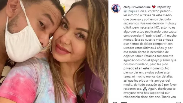 "Con el corazón pesado... les informo, a través de este medio, que Lorenzo y yo hemos decidido separarnos. Fue una decisión mutua y difícil, pero necesaria", dijo Rivera en un texto que publicó acompañando una foto de ambos en sus redes sociales.