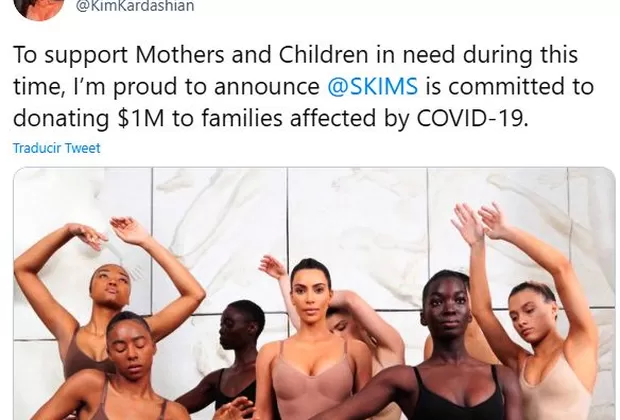 La iniciativa llegó al tiempo que indicó que volverá a poner a la venta la colección original de prendas de su firma Skims, cuyos beneficios por ventas dedicará a "apoyar a las madres y niños en necesidad durante este periodo".