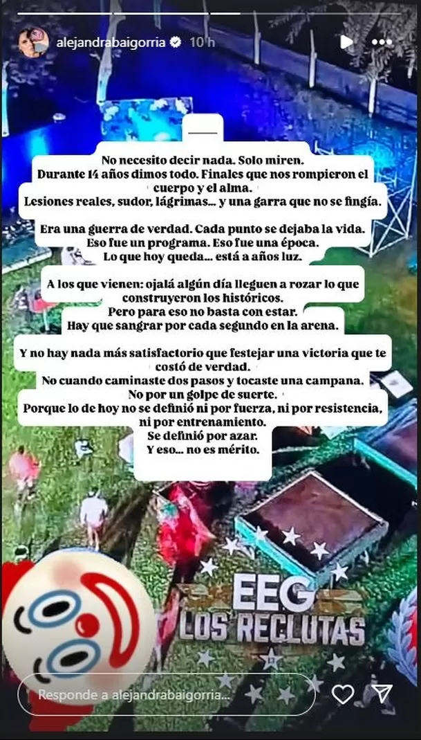 En su publicación, Alejandra Baigorria continuó comparando el nivel de exigencia del pasado con el presente del programa. “Era una guerra de verdad. Cada punto se dejaba la vida. Lo que hoy queda… está a años luz”, expresó. La rubia resaltó la entrega que ella y sus compañeros demostraron durante más de una década de competencia en EEG.