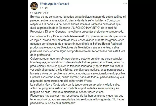 “Como Productor y Director de la teleserie AFHS, quiero informar de que, como es lógico, estaba muy al tanto de los sucesos diarios durante las grabaciones, apoyado por el equipo de producción que dirigía la señora Estela Redhead productora ejecutiva, los Directores de Televisión y sus asistentes, y ellos jamás me mencionaron algún comportamiento del señor Wiese que esté fuera de lo profesional”, comienza el comunicado de Efraín.