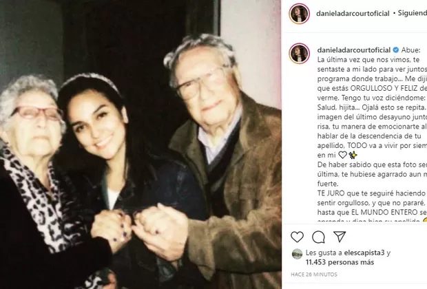 “Abue: La última vez que nos vimos, te sentaste a mi lado para ver juntos el programa donde trabajo… Me dijiste que estás ORGULLOSO Y FELIZ de verme. Tengo tu voz diciéndome: Salud, hijita… Ojalá esto se repita. La imagen del último desayuno juntos, tu risa, tu manera de emocionarte al hablar de la descendencia de tu apellido, TODO va a vivir por siempre en mí. De haber sabido que esta foto sería la última, te hubiese agarrado aún más fuerte. TE JURO que te seguiré haciendo sentir orgulloso, y que no pararé, hasta que EL MUNDO ENTERO se aprenda y diga bien su apellido. Vuele alto, viejito lindo… ¡Estoy orgullosa de haber sido y de ser su nieta! Cuando nos volvamos a ver, espero tengas todos esos recortes listos para enseñármelos… ¡Te voy a extrañar muchísimo! Hasta siempre, Luis Baltazar Darcourt García, el roble y patriarca de todos los DARCOURT”, posteó Daniela.