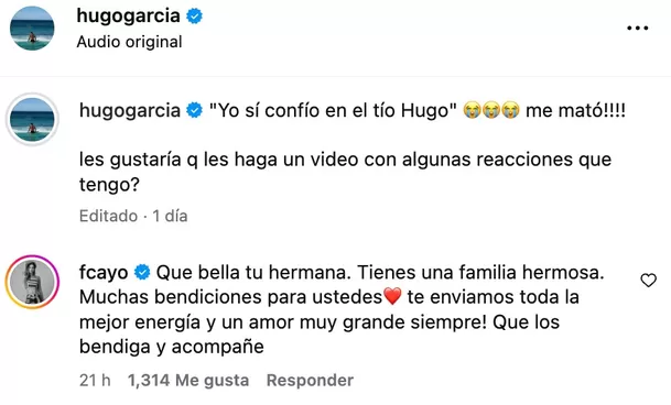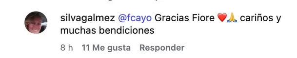 Horas después, la mamá de Hugo García respondió directamente a ese comentario. “Gracias Fiore”, escribió, acompañando sus palabras con un corazón y manos en señal de bendición. El intercambio quedó visible en la misma publicación del video familiar.