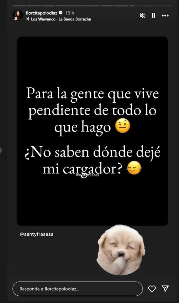 En la imagen difundida en su cuenta oficial, Florcita compartió un post de la página @santyfrasess que decía: “Para la gente que vive pendiente de todo lo que hago. ¿No saben dónde dejé mi cargador?”.