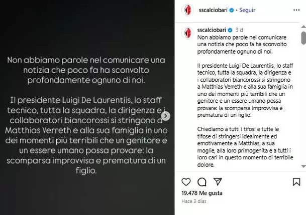 SSC Bari envía mensaje de condolencias a Matthias Verreth