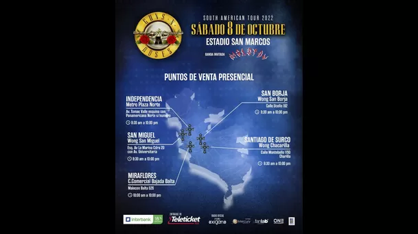 Debido a la gran demanda de entradas en su primer día de preventa, agotando el 80% de su stock, Teleticket activó varios puntos de venta presencial donde el público podrá adquirir sus boletos para el concierto que Guns N’Roses y Molotov ofrecerán el sábado 8 de octubre en el estadio de San Marcos.
