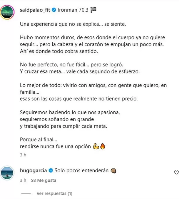 A través de un comentario en la publicación de Palao, García minimizó los cuestionamientos de terceros afirmando que solo un grupo reducido de personas entiende el sacrificio y el contexto de dicha participación deportiva.