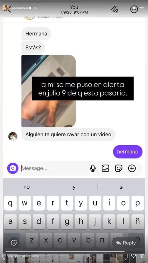 “A mí se me puso en alerta en julio 9 de que esto pasaría”, escribió Ladera en una captura de imagen de un chat con alguien, quien le advierte: “Hermana, alguien te quiere rayar con un video”.