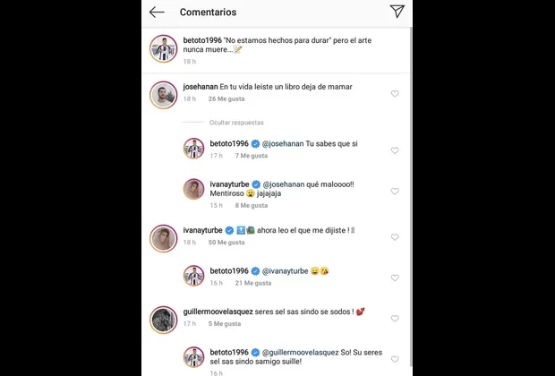 Beto Da Silva publicó una foto con la siguiente leyenda: “’No estamos hechos para durar’ pero el arte nunca muere”. De inmediato uno de sus amigos contestó: “En tu vida leíste un libro, deja de mamar”. En ese momento apareció Ivana: “¡Qué malo! Mentirosos, jajaja”.