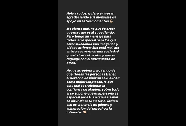 “Me siento mal, no puedo creer que esto me esté sucediendo. Pero tengo un mensaje para todos en especial para los que están buscando mis imágenes y videos íntimos: Eso está mal, me entristece vivir en una sociedad que disfrute del morbo y que se regocije con el sufrimiento de otros”, expresó.