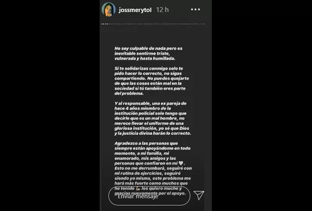 “El responsable es una expareja de hace cuatro años, quien es miembro de la institución policial. Es un mal hombre, no mereces llevar el nombre de una gloriosa institución, yo sé que Dios y la justicia divina harán lo correcto”, escribió Jossmery.